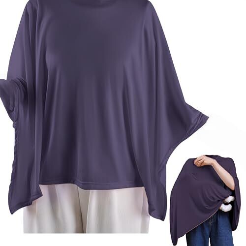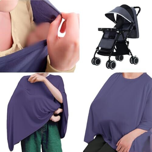 polyester and rayon blend; features 360° full coverage for privacy during breastfeeding; strap-free, stretchy poncho design for easy wear and hands-free feeding; multi-use functionality includes car seat canopy, stroller sunshade, and shopping cart cover; machine washable; generously sized; color