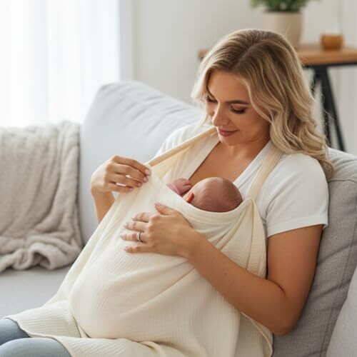 Soft, breathable muslin nursing cover with a rigid hoop for open-front viewing and privacy. Adjustable straps ensure a secure, comfortable fit for on-the-go breastfeeding in public or while traveling, featuring a beige color and discreet multi-layer design.