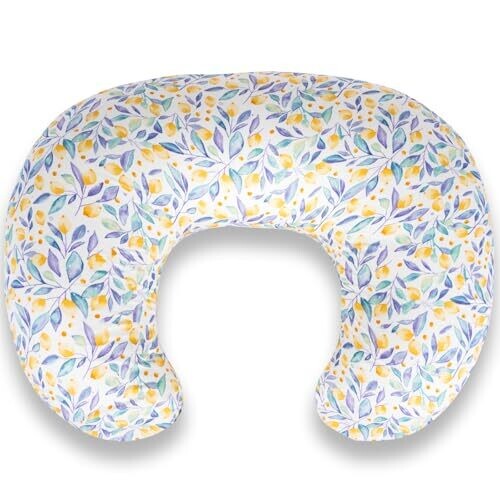 100% Cotton. The pillow features a C-shape design that positions the baby at an appropriate height while providing support for the caregiver's back and neck. It is designed as a standard-size nursing pillow with breathable construction and a washable cover to facilitate cleaning and maintenance. The product emphasizes hypoallergenic materials and suitability for feeding during both breastfeeding and bottle feeding, along with adaptability for tummy time and sitting support.