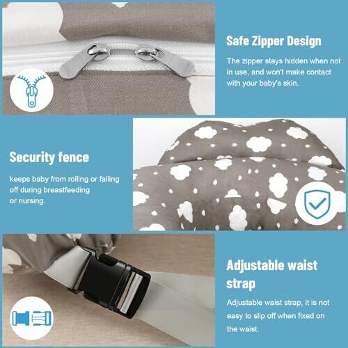 A marketing-friendly nursing pillow designed for mother and baby comfort during feeding and bottle feeding. Features a safety fence to prevent rolling, an adjustable waist strap for secure fit, a removable cotton cover for easy cleaning, and versatile support for propping and tummy time.