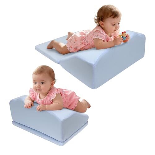 Supportive tummy time pillow helps strengthen neck, shoulder, and back muscles while promoting upright positioning after feeding to relieve reflux and gas. Adjustable height, breathable cotton cover, memory foam core, and versatile use for feeding, burping, and play.
