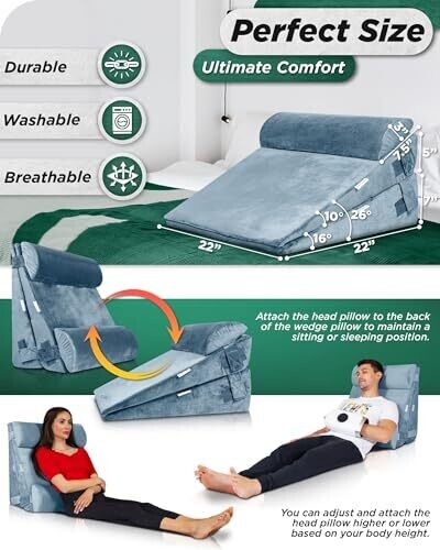 Experience enhanced comfort with the SAGIWO wedge pillow headboard set. Four memory foam wedges can be arranged for sleeping, reading, or working at a gentle incline. Supports acid reflux relief, post-surgery comfort, and secure seated posture with a soft plush cover.