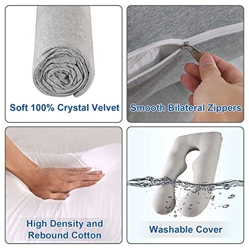 Ergonomic U-shaped pillow provides full-body support for head, back, hips, legs and belly, easing pregnancy discomfort and improving sleep. Skin-friendly knitted cotton cover with anti-mite properties, removable cover and lining with independent zippers, adjustable inner core height, versatile for nursing and recovery.