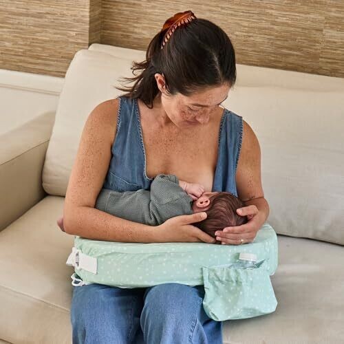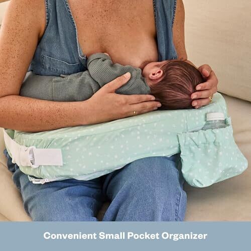 Elevate feeding with a minty geometric slipcover that fits the My Brest Friend Original Nursing Pillow. Designed for secure, adjustable coverage, it’s easy to care for and durable, with a handy pocket for burp cloths and essentials.