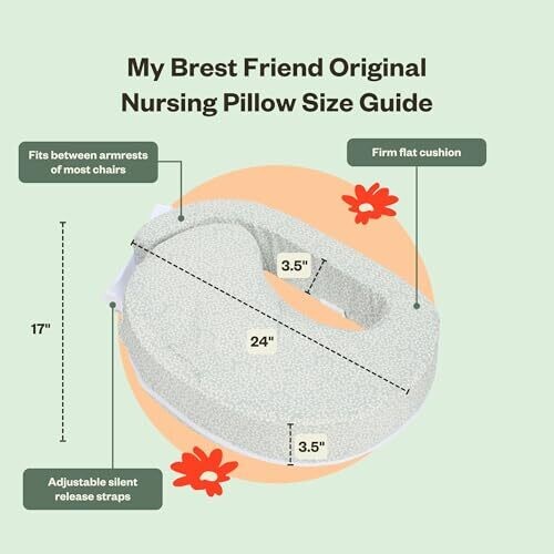 Ergonomic nursing pillow designed to support mom and baby with a secure wrap-around fit. Features adjustable silent-release straps for a personalized fit and a Flowery Meadow slipcover. Promotes proper posture, eases back and neck discomfort, and suits both breastfeeding and bottle-feeding.